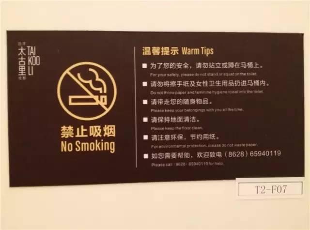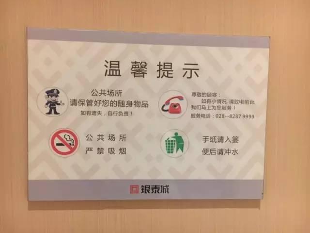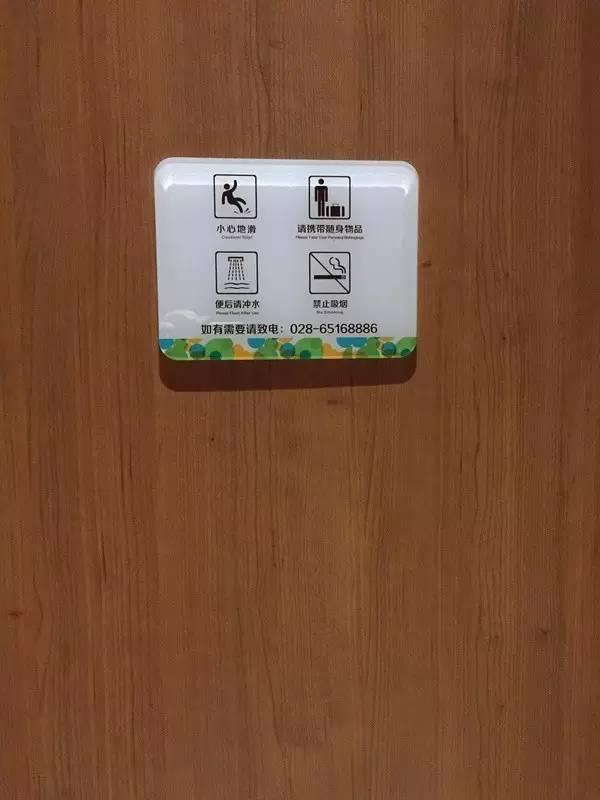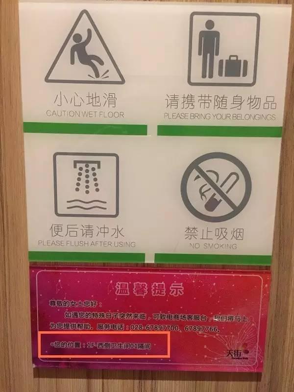 在每个隔间的门背后,均设有小心地滑、便后请冲水、禁止吸烟等标识,在提示牌底端留有商场的电话,不过,这里并没有提示有卫生巾的服务。