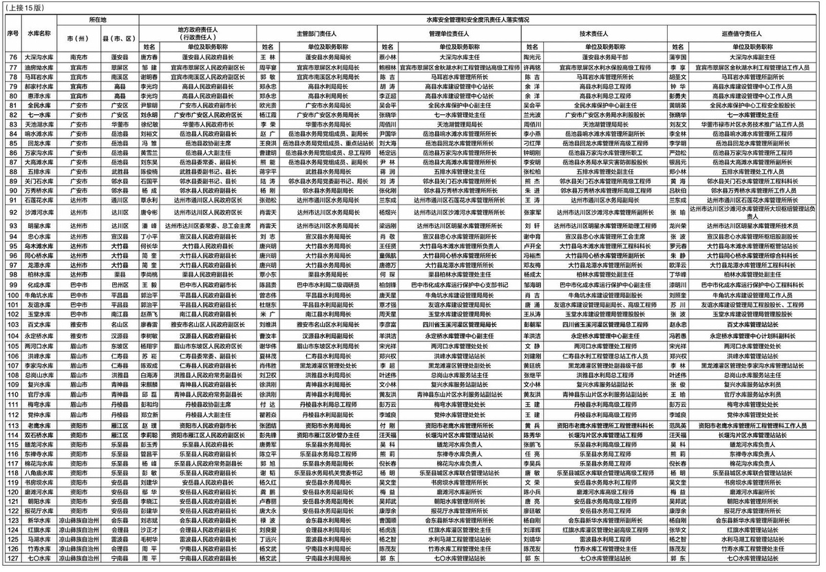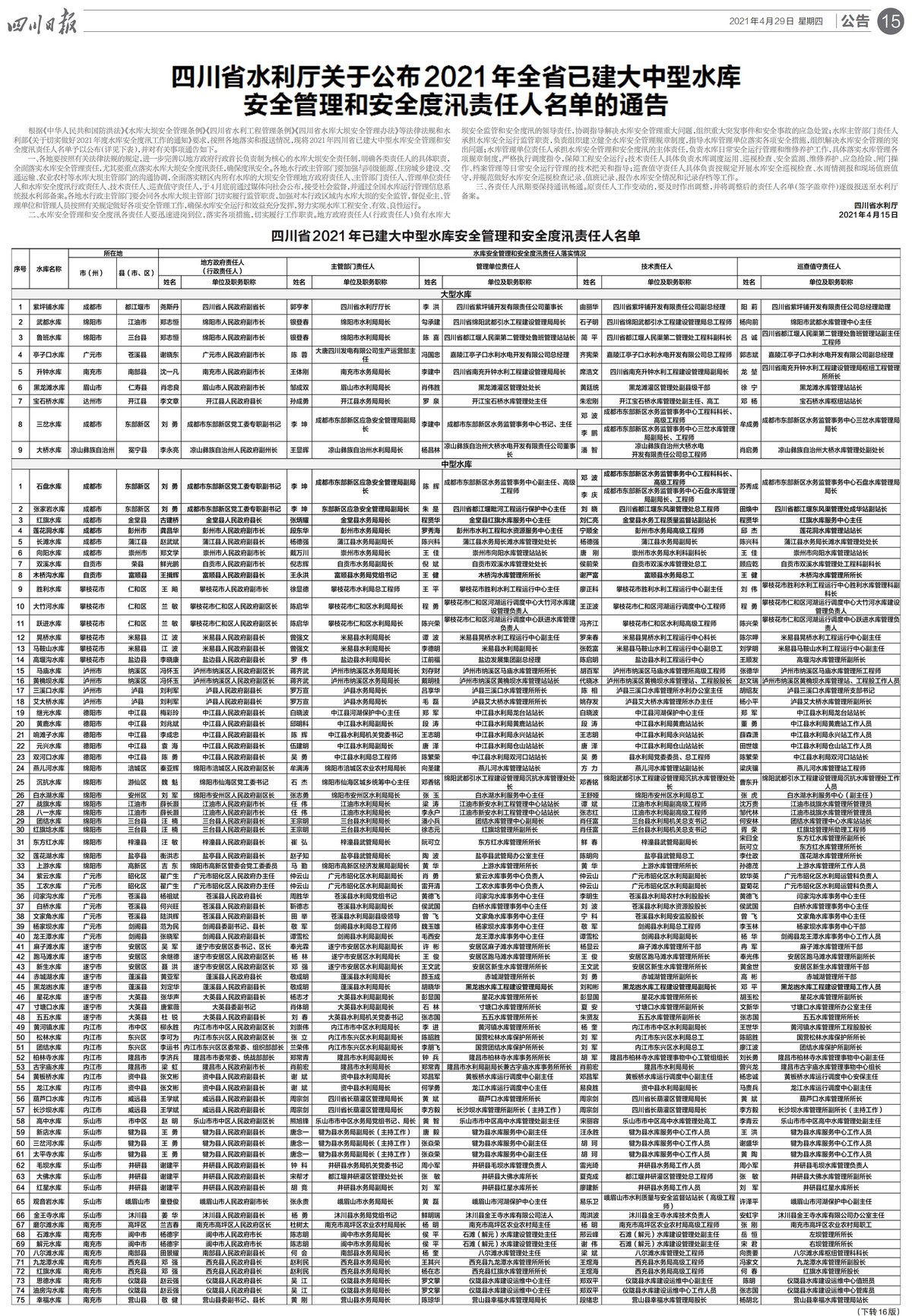 根据《中华人民共和国防洪法》《水库大坝安全管理条例》《四川省水利工程管理条例》《四川省水库大坝安全管理办法》等法律法规和水利部《关于切实做好2021年度水库安全度汛工作的通知》要求,按照各地落实和报送情况,现将2021年四川省已建大中型水库安全管理和安全度汛责任人名单予以公布(详见下表),并对有关事项通告如下。