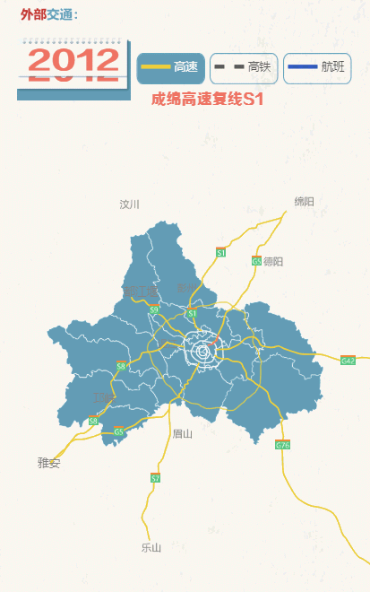 1987年,飞往加德满都的航班在双流机场起飞,成都拥有了第一条国际航线;截至2017年,成都机场航线总数达315条,其中国际(地区)航线更是达到了104条。庆祝1995年成渝高速通车的鞭炮声仿佛还在耳边回响,如今16条高速编织的路网城市发展驶上的快车道。成渝高铁、成绵乐客专、西成高铁的通车更是让这座城市成为最具综合优势的区域门户枢纽。