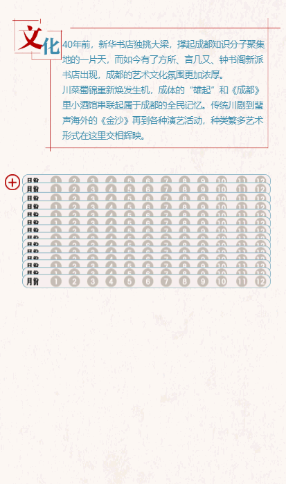 40年前,新华书店独挑大梁,撑起成都知识分子聚集地的一片天,而如今有了方所、言几又、钟书阁新派书店出现,成都的艺术文化氛围更加浓厚。川菜蜀锦重新焕发生机,成体的“雄起”和《成都》里小酒馆串联起属于成都的全民记忆。传统川剧到蜚声海外的《金沙》再到各种演艺活动,种类繁多艺术形式在这里交相辉映。