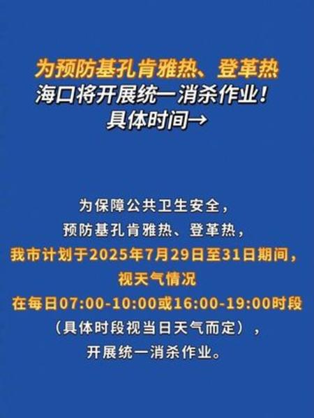 为预防#基孔肯雅热 、#登革热 ,海口将开展统一消杀作业!具体时间→#海口