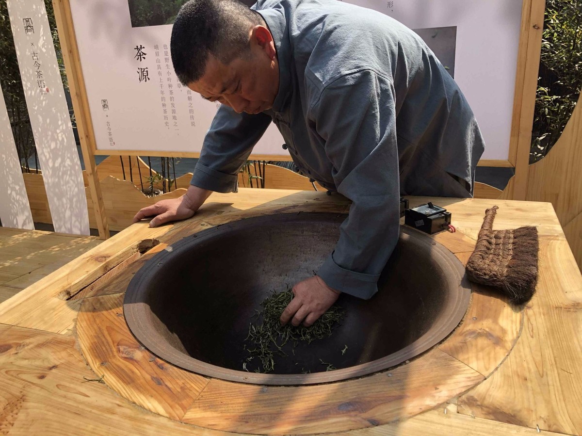 “茶文化月期间,我每天都在这里制茶,持续到4月20日。” 专业制茶师傅何俊华的手在一口大铁锅中来回翻动,正忙着手动烘干2两绿茶。他告诉记者,自己从1996年开始手工制茶工作,对茶已经有了一种情怀。在制茶过程中,最耗时的工序是手动烘干,平均烘干2两茶叶就需要至少两小时。