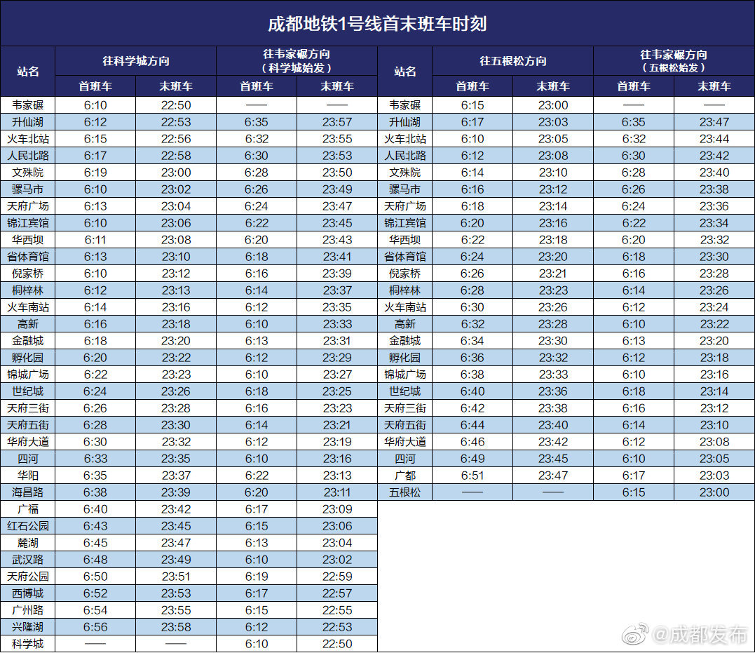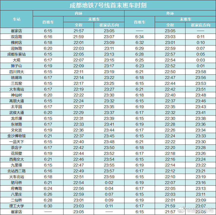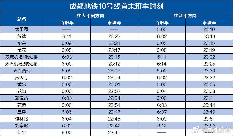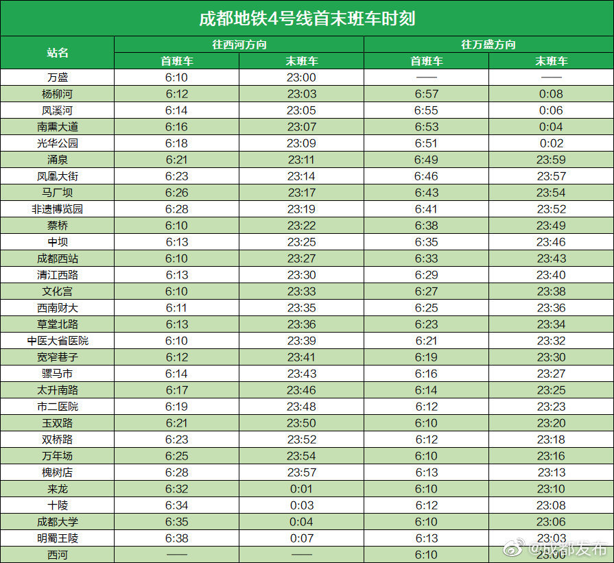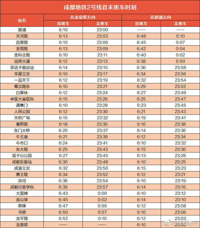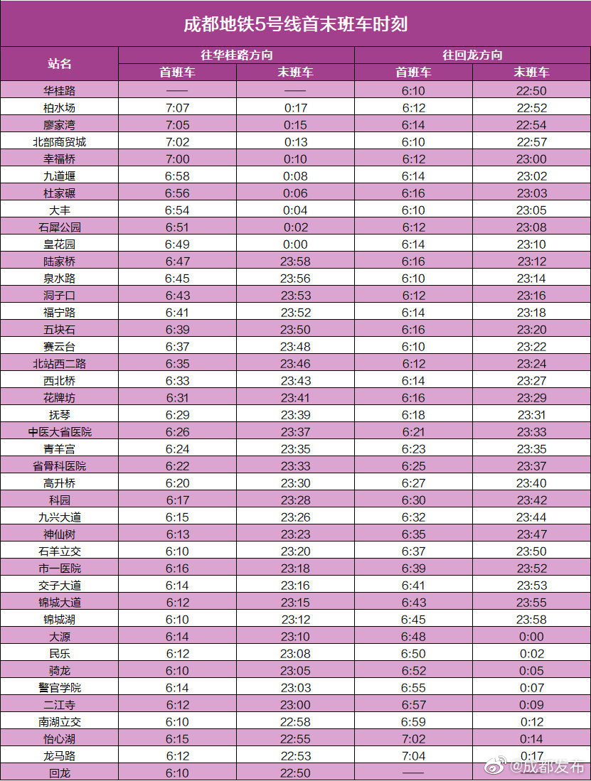 明天上午10点,成都地铁五线齐发。新线开通后,成都地铁各线首末班车时刻表如下。