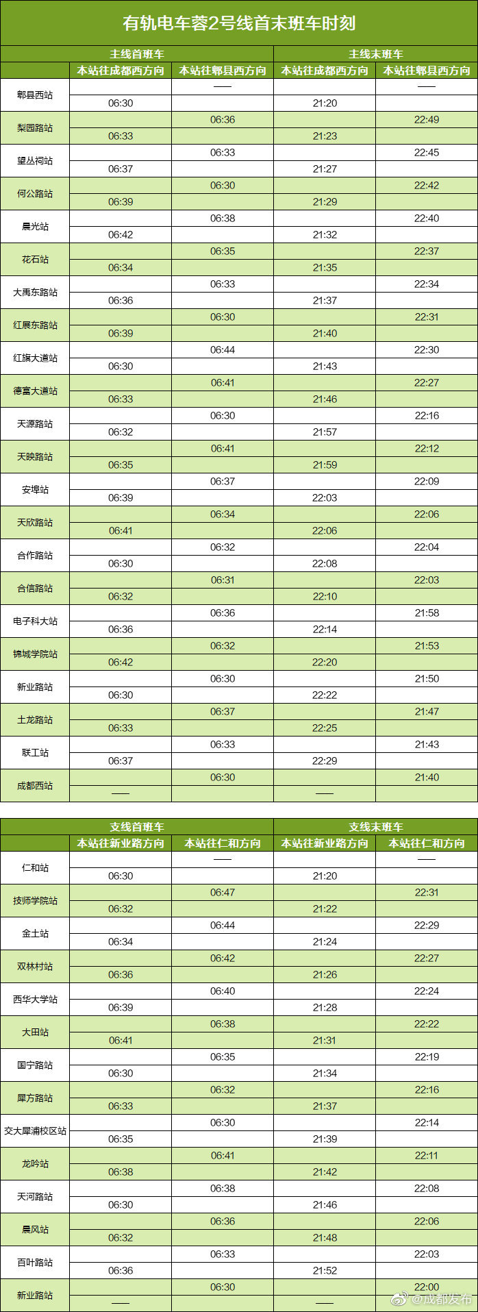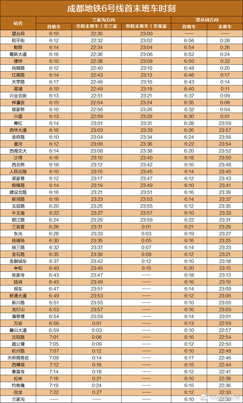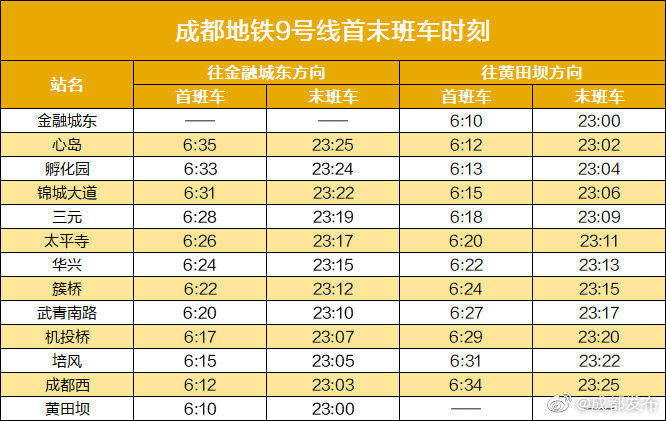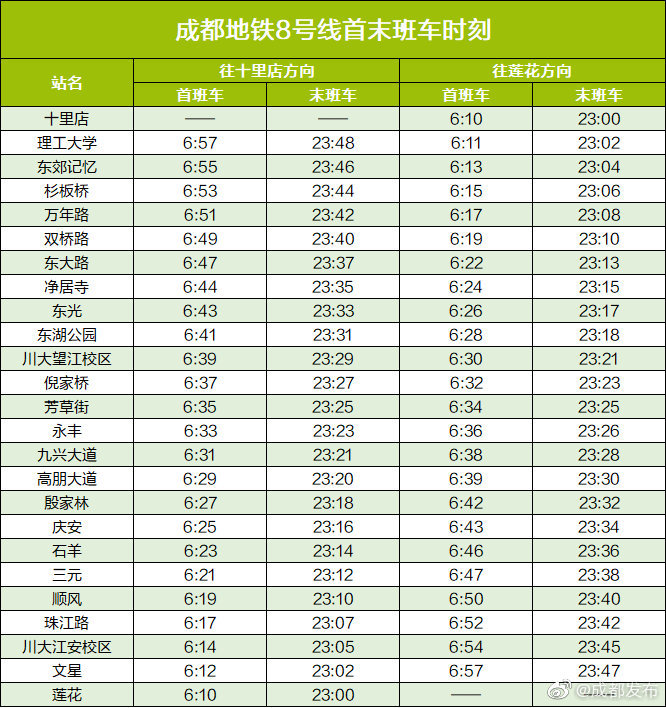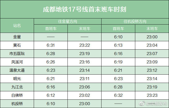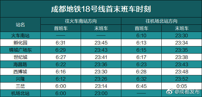 明天上午10点,成都地铁五线齐发。新线开通后,成都地铁各线首末班车时刻表如下。