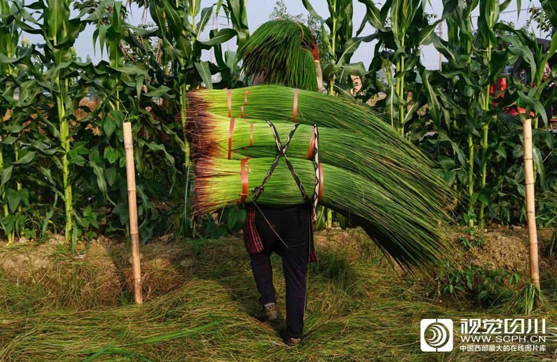 来自凉山州、攀枝花市的农民工挥镰、割草、除杂、打捆、搬运、过称、装车,一派农耕收获的田园风景。