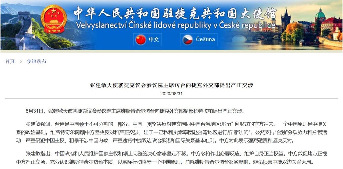 中国驻捷克大使馆网站消息,8月31日,张建敏大使就捷克议会参议院主席维斯特奇尔访台向捷克外交部副部长特拉帕提出严正交涉。
