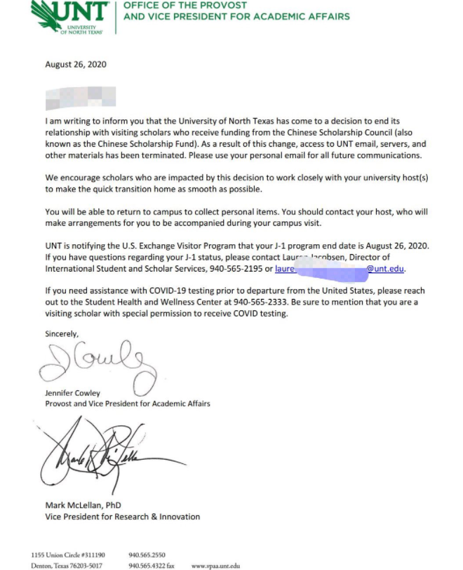 近日,美国一所大学突然宣布驱逐所有受中国国家留学基金委员会资助的公派访问学者和留学生,并限他们在一个月内离境。尽管这件事目前尚未被任何美国主流媒体所报道,但从“推特”等美国的社交网站上来看,自上周起,一封来自美国北得克萨斯州大学的邮件截图就已经开始在这些社交平台上流传。从这封邮件截图来看,该校于8月26日突然决定中止受中国国家留学基金委员会资助的公派访问学生学者在该校学习的资格,并剥夺了这些人继续使用学校服务器、电子邮箱等学习资料的权利,仅允许受影响的人返校领取个人物品。