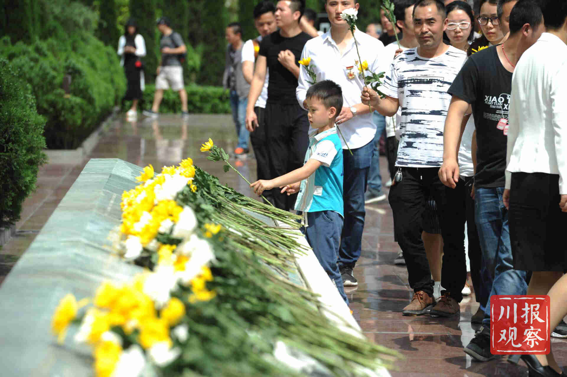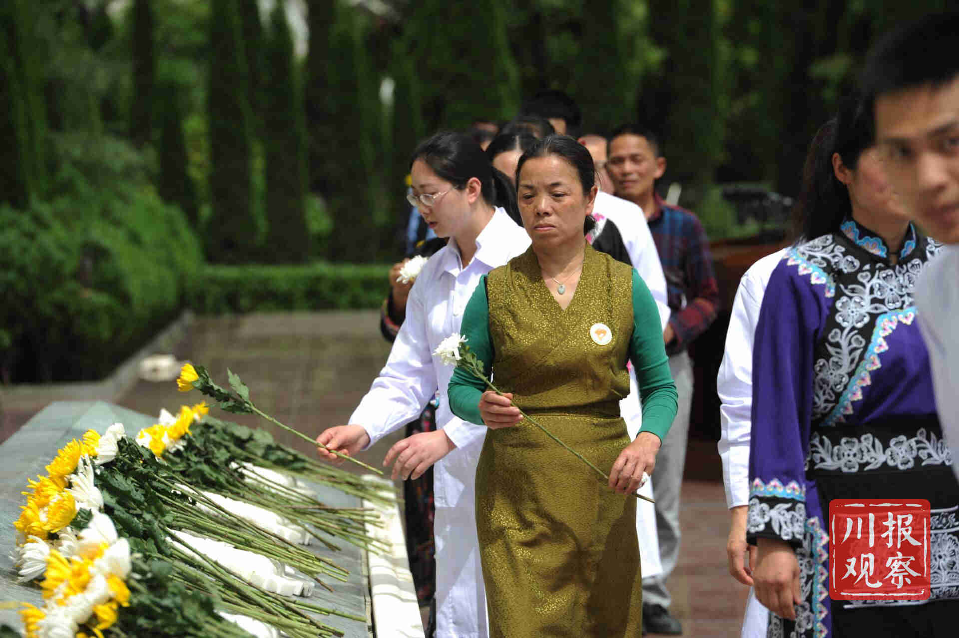 纪念仪式最后,思念曲响起。出席纪念仪式的军地领导和社会各界人士手持菊花,依次缓步走向献花台,深情俯身献花,寄托思念之情。