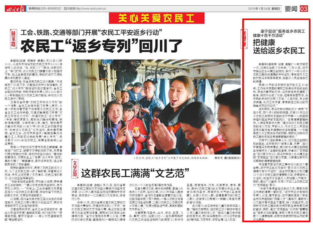 守住春节前后农民工集中返乡的这个黄金期,遂宁市卫生系统启动“服务返乡农民工健康十百千万活动”,在全市范围内分别设置10个返乡农民工医疗健康服务站,开展百场义诊活动,并组织千名医务人员加强入户随访。同时,通过广泛宣传,引导1万名以上农民工签约“家庭医生”服务。