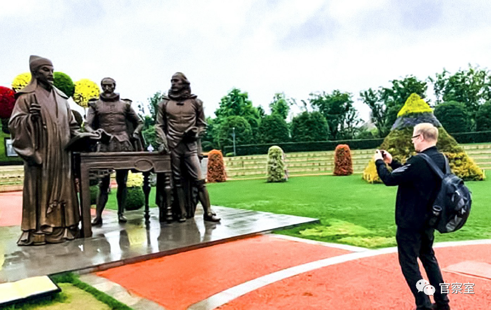 抚州三翁花园里的“三翁”雕像引得国内外游人驻足观赏。